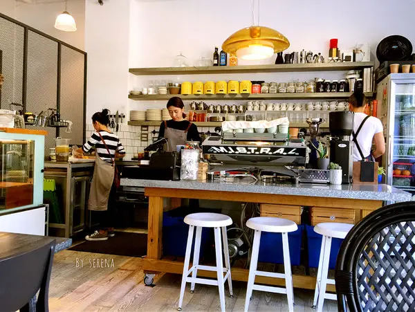 咖啡店內一進去就看到簡單的泡咖啡吧檯和小廚房~整體明亮整潔,完全開放透明。