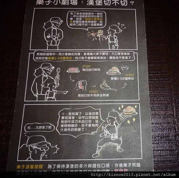 桌上有整齊的餐具和水杯,餐具還設有漢堡包裝袋,把漢堡包入紙袋食用,食用漢堡不怕弄髒手,這裡也有食用漢堡的秘笈,這家店不主張把剛製作完成的漢堡切開,這樣會破壞漢堡的美味,建議放置3至5分鐘再用刀切開.其實我個人對漢堡不習慣切開,是整個餡料包起來咬入口裡,如果餡料夾層太多,會先吃掉一部份夾層餡料,再用麵包把剩下的餡料夾起來食用,無論食用方法如何,看個人喜好而定.