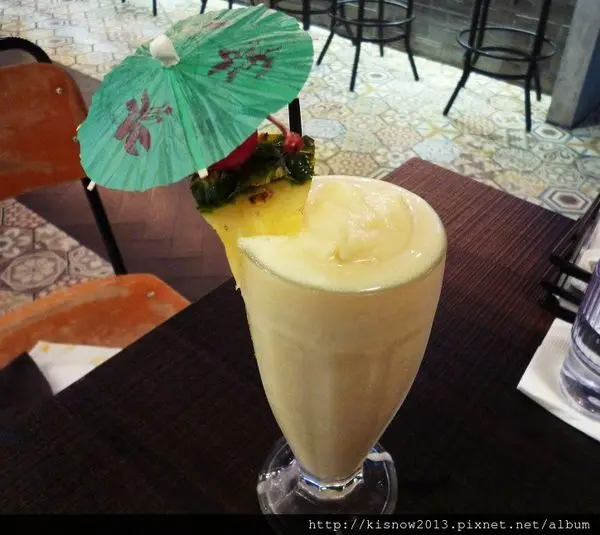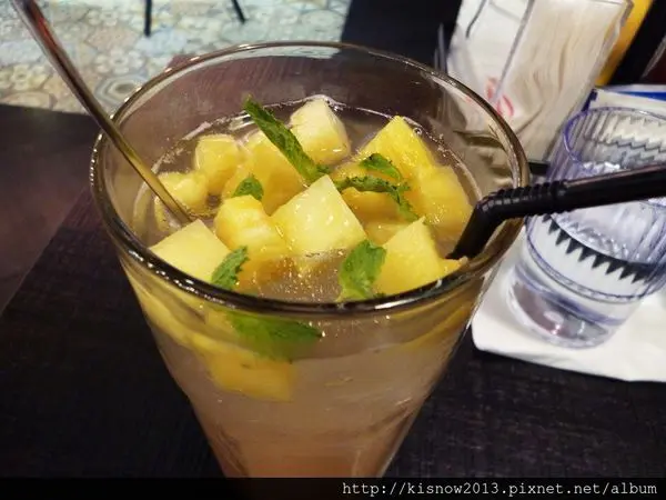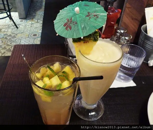 這次飲料部份我是選擇鳳梨椰子冰沙和鳳梨薄荷氣泡飲,鳳梨椰子冰沙本是調酒類,這次是作成無酒精飲料,乳黃的冰沙上面頂著一朵綠色的小雨傘和鳳梨杯飾,看起來很有熱帶風情,心情也跟著去夏威夷渡假.喝起來的口感,冰沙質感細密,沒有粗糙的顆粒,鳳梨的甜和椰子濃郁香氣在口中交錯,口感相當冰涼香甜,酸度很低,喝完冰沙,把裝飾用的櫻桃咬進口裡,製造一點口感上的甜蜜.
