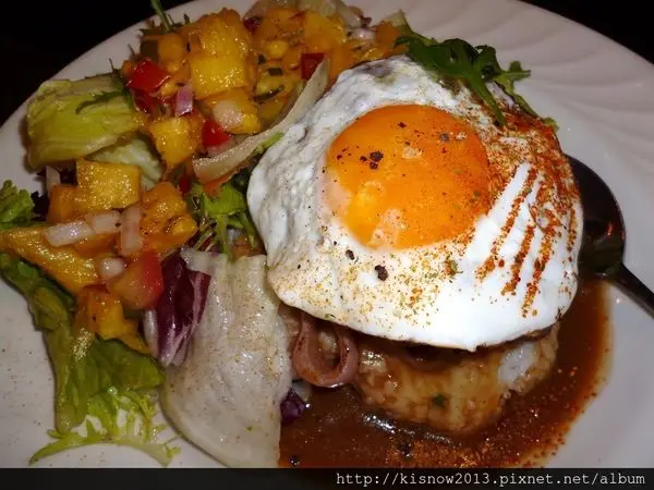 夏威夷漢堡排飯是由一個如同太陽的荷包蛋,白飯,漢堡排肉,再加上生菜沙拉和鳳梨蕃茄莎莎醬所構成,一大盤的餐點看起來營養豐富,水果,肉類,蔬菜和蛋白質都兼顧.