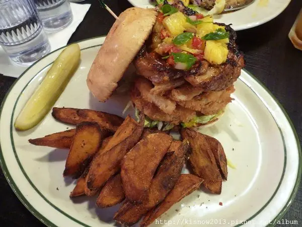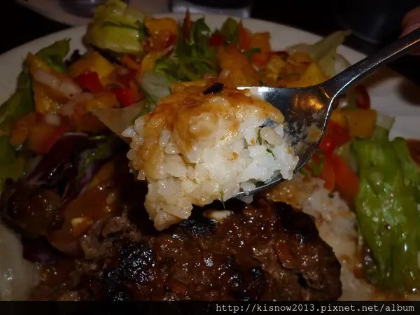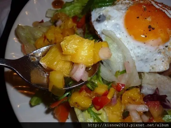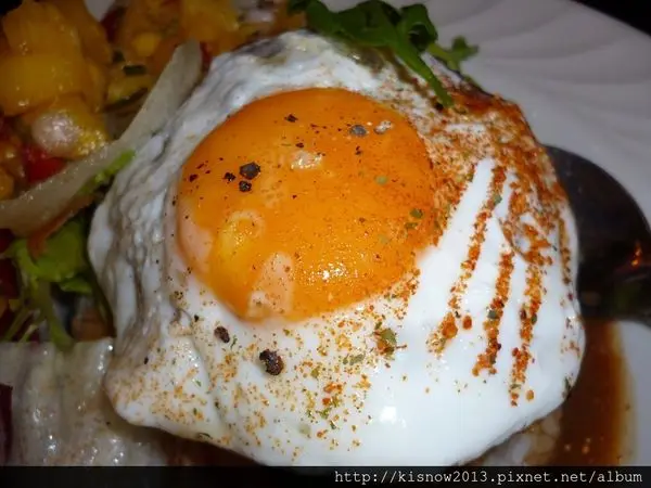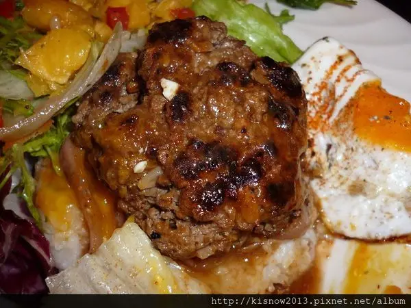 荷包蛋是半熟程度,新鮮的蛋黃吃進口裡,質感相當軟嫩,漢堡排是紮實的碎肉構成的肉排,外表微焦,吃起來的口感,肉質均勻紮實,沒有多餘的油脂,具有充份香料的滋味,鳳梨塊和蕃茄構成莎莎醬,覆蓋在生菜沙拉上,蕃茄塊的莎莎醬本身口感酸香,帶有一點微鹹,加入鳳梨塊後,吸收鳳梨香甜的滋味,和生菜搭配,口感酸甜兼具,變得相當爽口.覆蓋在肉排之下的白飯,飯粒沒有過於軟爛,因為吸收醬汁和鳳梨滋味,口感變得濃郁香甜.