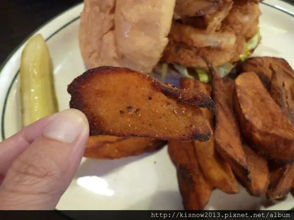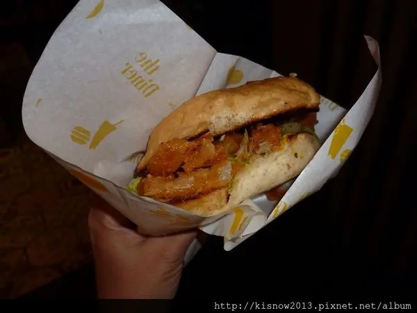 夾層除了雞腿排肉,還有酥炸洋葱圈和生菜絲,酥炸洋葱圈口感油酥,顯得油膩,須要生菜絲爽脆平衡口感,漢堡底層加了黃芥末醬,口感帶一點微嗆微苦,配合大型漢堡麵包,慢慢咬進口裡,呈現多元的滋味,但最後還是被雞腿排的美味蓋過去.