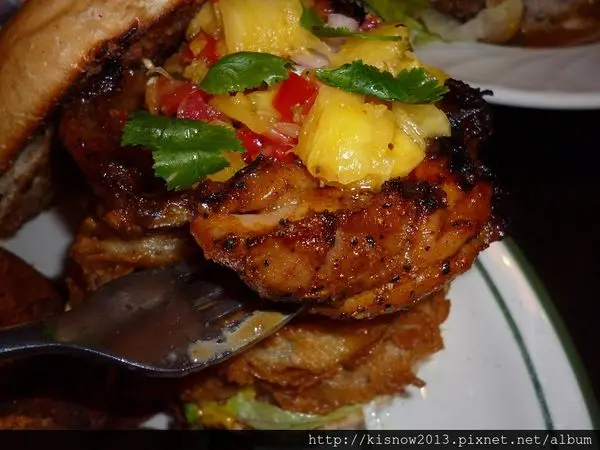 雞腿排質感厚實,採用萬金畜牧場的萬香雞,經過醃製,再用油煎,上面有微微的焦香,再搭配一點鳳梨莎莎醬,刀子切下去,肉汁流了下來,吃起來的口感肉質軟嫩,油脂很低,油脂和肉汁合為一体,鳳梨莎莎醬浸入雞腿肉質,多了香甜的滋味.