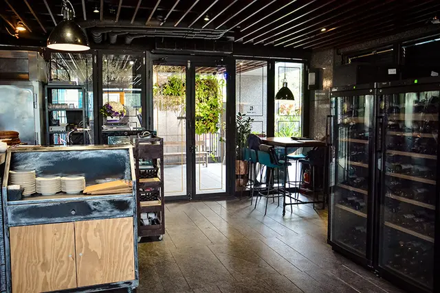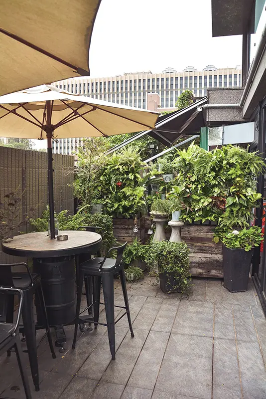 戶外用餐區,旁邊有面綠色植栽牆,是讓人覺得清新且放鬆的小陽台。