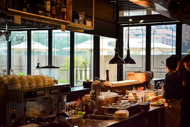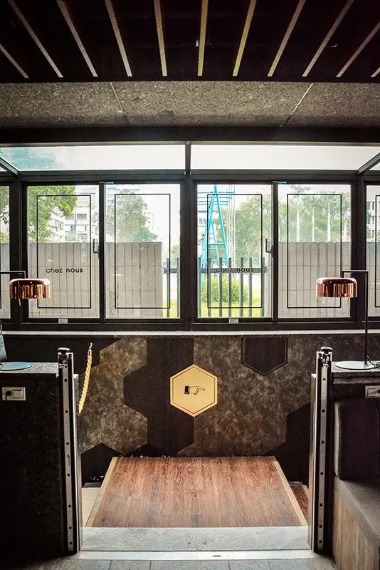 因承襲原來酒吧的空間,吧檯位置轉身變成廚房,半開放式廚房既可看到廚師們忙碌的身影,也能看到製作中熱騰騰的菜餚,再用餐期間搭配牛排炙燒的聲音更為生動,雖說廚房空間似乎有點小,但不影響出菜效率,即使身處在同一空間也不會覺得有油煙圍繞。