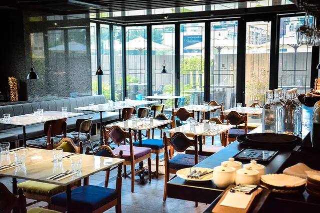 室內桌子與席位可依人數作調整,看起來靠著長沙發這面的座位區,還蠻適合團體聚餐。