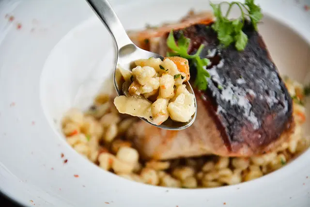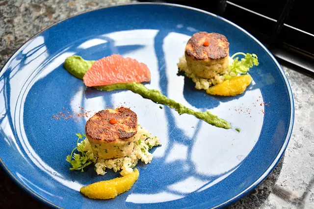 這裡的蟹餅看起來就像在吃法式料理,主廚將美國蟹肉混入香菜、蝦夷蔥、甜椒將其塑形成干貝的模樣,上頭點綴拉差香甜辣椒醬(Sriracha sauce),吃起來口感軟綿,風味香氣濃厚,可嚐到一絲一絲的蟹肉,尤其搭配旁邊的香菜醬汁,有清香檸檬氣息輔佐更顯清爽。而底部的藜麥有與蜂蜜、橄欖油拌炒過,顆粒分明的Q彈口感剛好製造不同層次的感受。