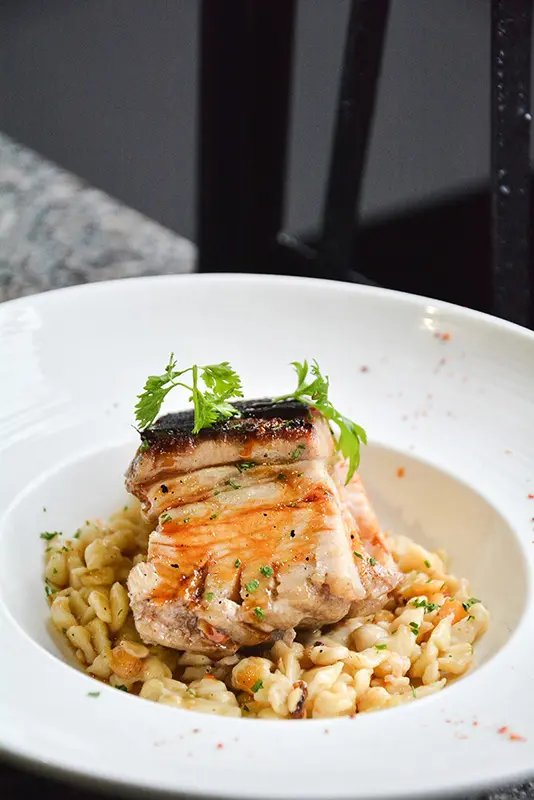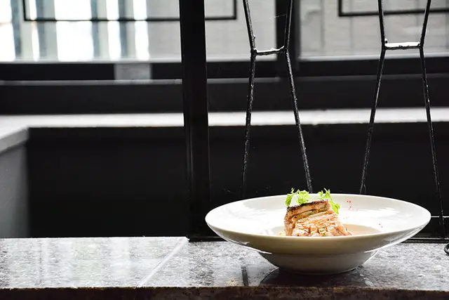 加州多元化的風格也囊括料理領域,中港風味料理就屬東坡肉最具東方特色,其脆皮燒肉便是以此為概念,繁雜的以香料醃製兩天,再以低溫烹調12小時使肉質軟化,最後將表皮煎至焦脆後淋上特製焦糖醬。我個人其實不喜歡吃肥肉,但這邊的豬肉口感相當軟滑彈嫩,搭配上層脆皮又將口感香氣帶往另一層級。