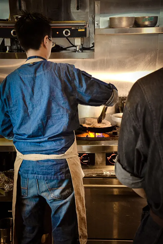 主廚接續在烹調Large Plates項目的肉排,最精彩部分是可以看到激烈的火焰與吱吱作響的烤盤與鍋具。
