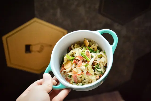 下方是為增加飽足感的德式麵疙瘩,與洋蔥、蘿蔔、西洋芹等蔬菜拌炒,有點軟嫩加嚼勁的脆韌口感讓我想到薏仁顆粒。