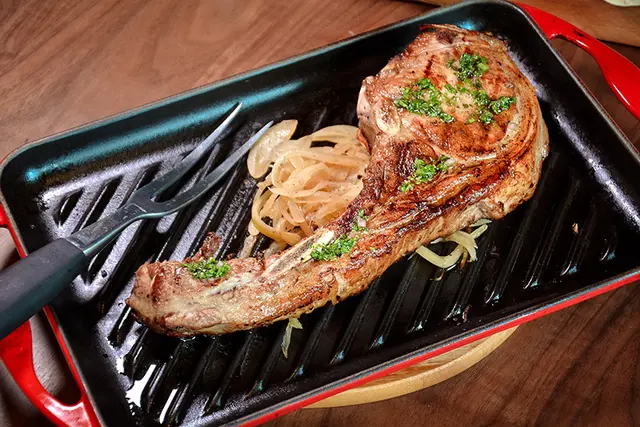 選用美國Choice安格斯牛的紅屋牛排,同時擁有紐約客與菲力二種不同肉質,在台灣鮮少供應,在這邊便能享用這款豪邁料理,係以鹽、胡椒、大蒜、奶油等香料真空靜置冷藏一夜後,再下鍋煎之前以49℃舒肥一小時,接著上炭烤台燒烤,整份尺寸厚而大,適合多人享用。