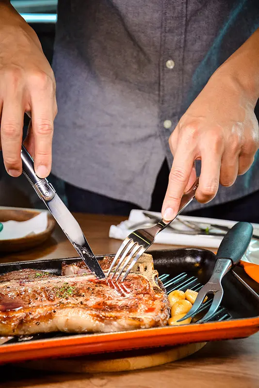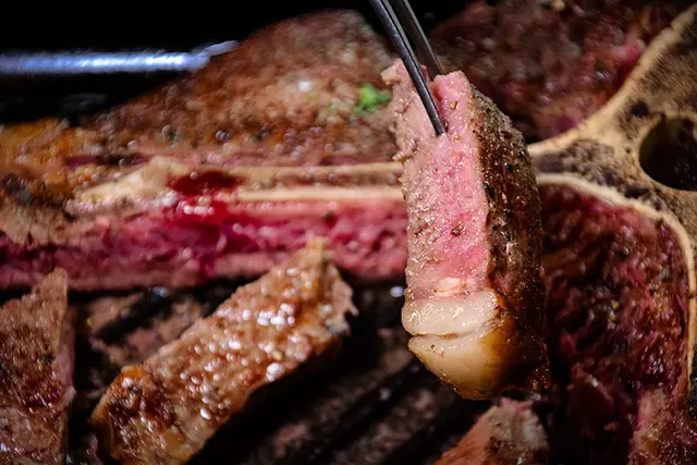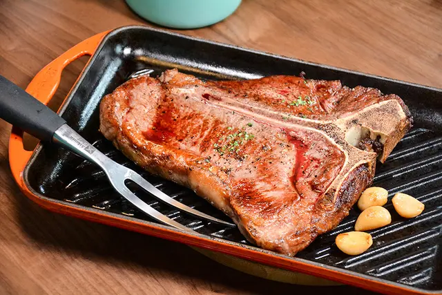 T型骨頭上層範圍較小的是菲力,油花分布少也是最好吃的部位,口感軟嫩,其肉香四溢多汁還帶甜味。大範圍的紐約客則是紮實有勁,稍微費力些但是越咬越出汁。