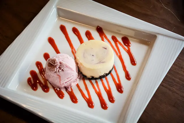 重乳酪蛋糕的內餡裡還有藍莓,一旁則是紐西蘭的波森莓冰淇淋,使得起司的濃厚風味配上酸香莓果香與滑順冰淇淋還能吃得很清爽。