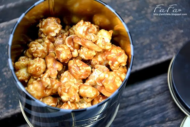 在試吃時不抱著希望放到最後才吃,反而我還可接受,外層焦糖是琥珀般閃亮,部分爆米花球還跟著細長杏仁片,