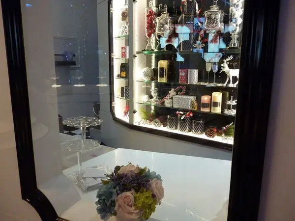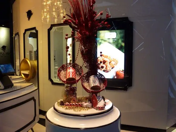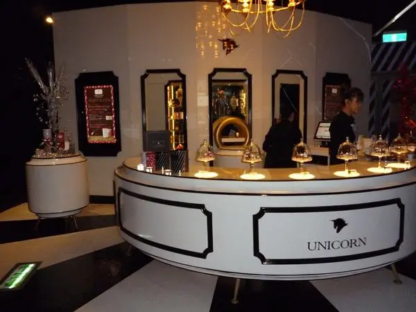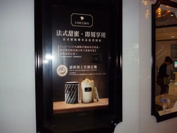 Unicorn 法式甜點爆米花(京站店)位於京站百貨5樓,靠近華納威秀影城,看電影最好的伙伴果然是爆米花,搭上手扶梯到5樓,看到一個類似百貨公司的精品櫃枱,印象中賣爆米花的店家通常像速食餐飲的櫃枱,服務人員都是休閒裝扮,但這家爆米花店看起來像百貨公司的精品專櫃,半圓型的白色櫃枱,如果不是標明爆米花圖案,我會誤以為是某個精品或甜點櫃枱,璀璨的水晶燈,再加上週圍聖誕裝飾,把這家店的專櫃襯顯得華麗迷人.休閒零食爆米花像精品一般販賣,雖然有點衝突感,但增加我的興趣和好奇心.