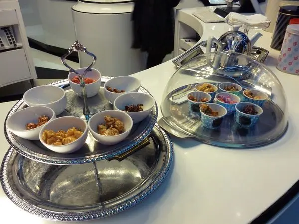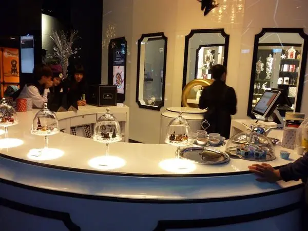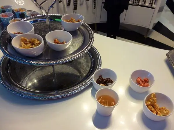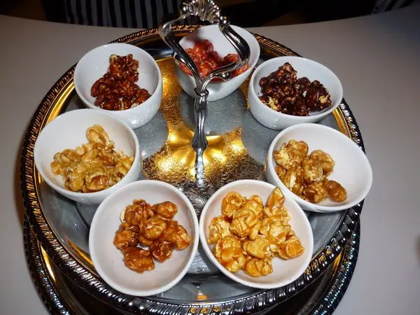 櫃枱上擺滿試吃的爆米花,爆米花共有7種口味,分門別類擺在英式下午茶盤子上,服務人員穿著整齊制服,親切提供每一位好奇嚐鮮的顧客試吃,並且對每種口味爆米花進行講解說明,對於爆米花發問的問題,服務人員都會耐心解答,試吃過程中還提供小杯茶水,服務真的很貼心.