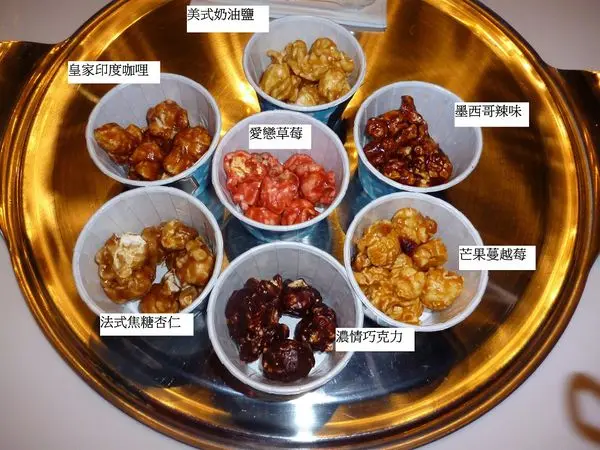 這家店目前總共有7種爆米花口味,包括:芒果蔓越莓,濃情巧克力,法式焦糖杏仁,墨西哥辣味,皇家印度咖哩,美式奶油鹽,以及愛煉草莓.濃情巧克力口味的爆米花外表裹上很深的巧克力,吃起來的口感有很濃郁的苦甜滋味,但爆米花相當有脆度,感覺像金沙巧克力的口感;芒果蔓越莓口味的爆米花外層裹濃郁的黃色,吃起來的口感,爆米花的脆度隱含芒果香甜滋味.