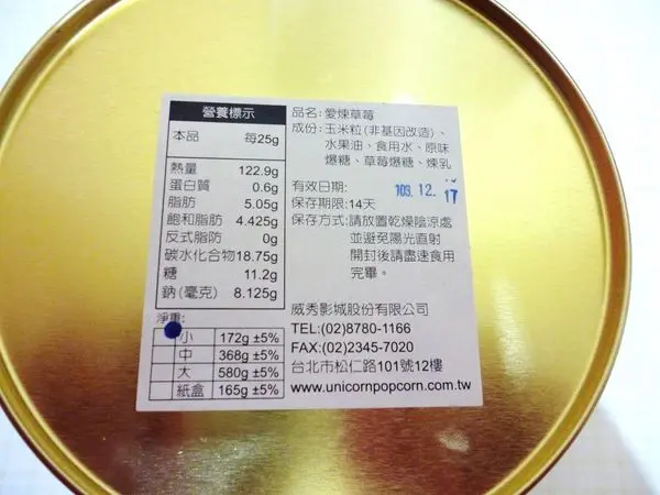 愛煉草莓口味的爆米花我是用白色圓型鐵罐包裝,鐵罐下面標示製造成份和營養成份,並且標示有效到期日,此產品可以保存14天,重量容量約160g±5%我個人是習慣開封後,把蓋子蓋緊,放入冰箱冷藏,冷藏後的爆米花脆度和滋味沒有任何改變.