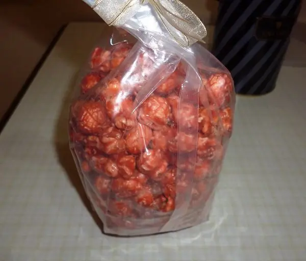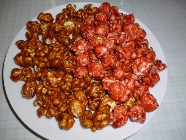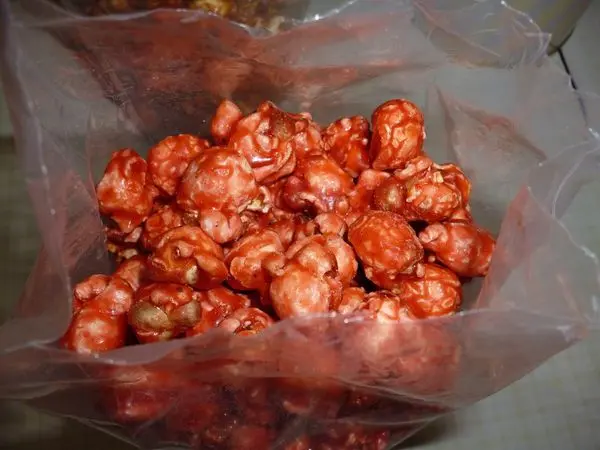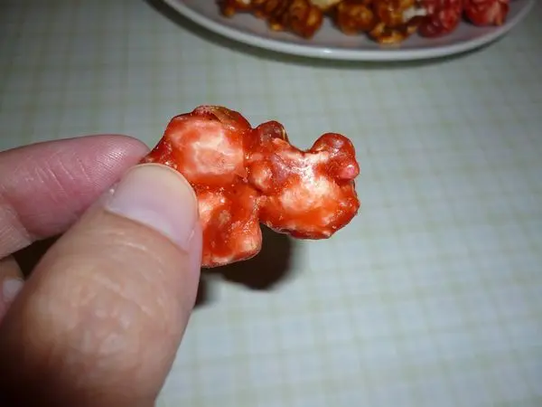 愛煉草莓爆米花外層有很明顯的紅色,草莓爆糖和煉乳調味,外型有些是不規則狀或圓型小蘑菇造型,吃起來的口感,爆米花一入口就是香脆的質感,隨著嘴巴咀嚼不但有草莓的滋味,還散發濃郁的甜度.這款爆米花雖然甜度較高,但也是很唰嘴,即使口中充滿草莓甜度,也要一口接一口.