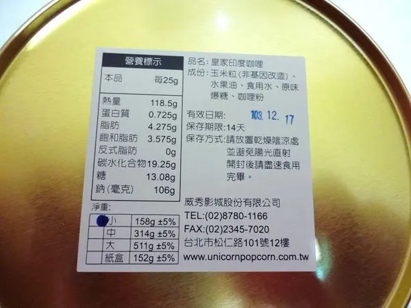 皇家印度咖哩用黑色圓型鐵罐包裝,鐵罐下面標示製造成份和營養成份,並且標示有效到期日,此產品可以保存14天,重量與保存方式與愛煉草莓口味爆米花相同,我也是習慣把蓋子蓋緊,放入冰箱冷藏.