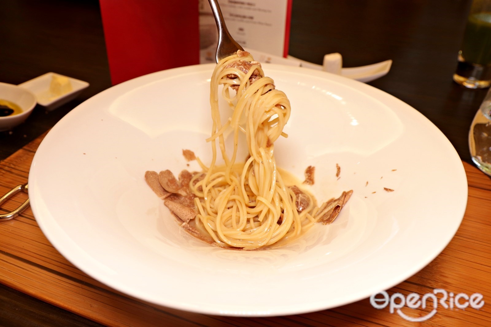 主廚現刨「阿爾巴白松露」,珍稀白松露輕灑於熱騰騰的義大利麵上,瞬間在席間激起白松露的濃郁香氣。