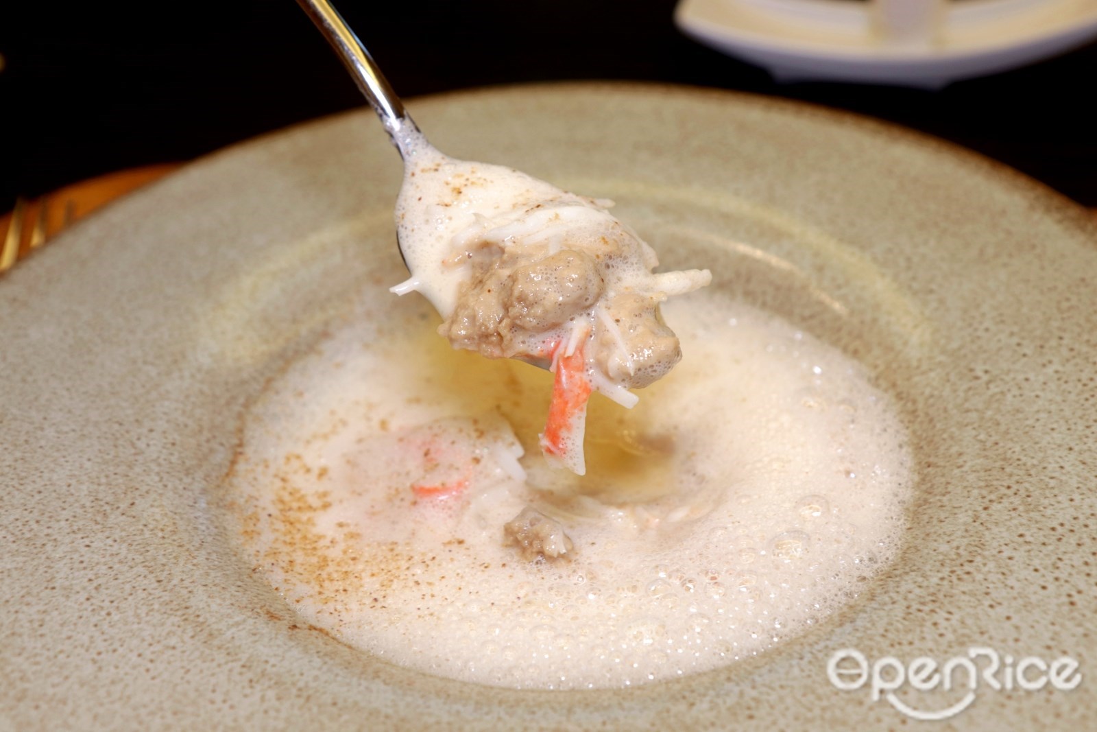 頂級珍稀盛宴就在開胃小品後正式展開,以「魚子醬與煙燻起士冰淇淋」揭幕。龍眼殼煙燻的 feta cheese 被細膩製成冰淇淋,搭配茶梅與橄欖油,酸香與果香在口中交融。選用2.8mm的魚子醬搭配,鹹鮮味釋放較慢,能夠與冰淇淋、茶梅的酸甜香氣形成漸進的味覺,平衡並提升整體層次,每一口都含蓄地展現秋季饗宴的精緻風味。
