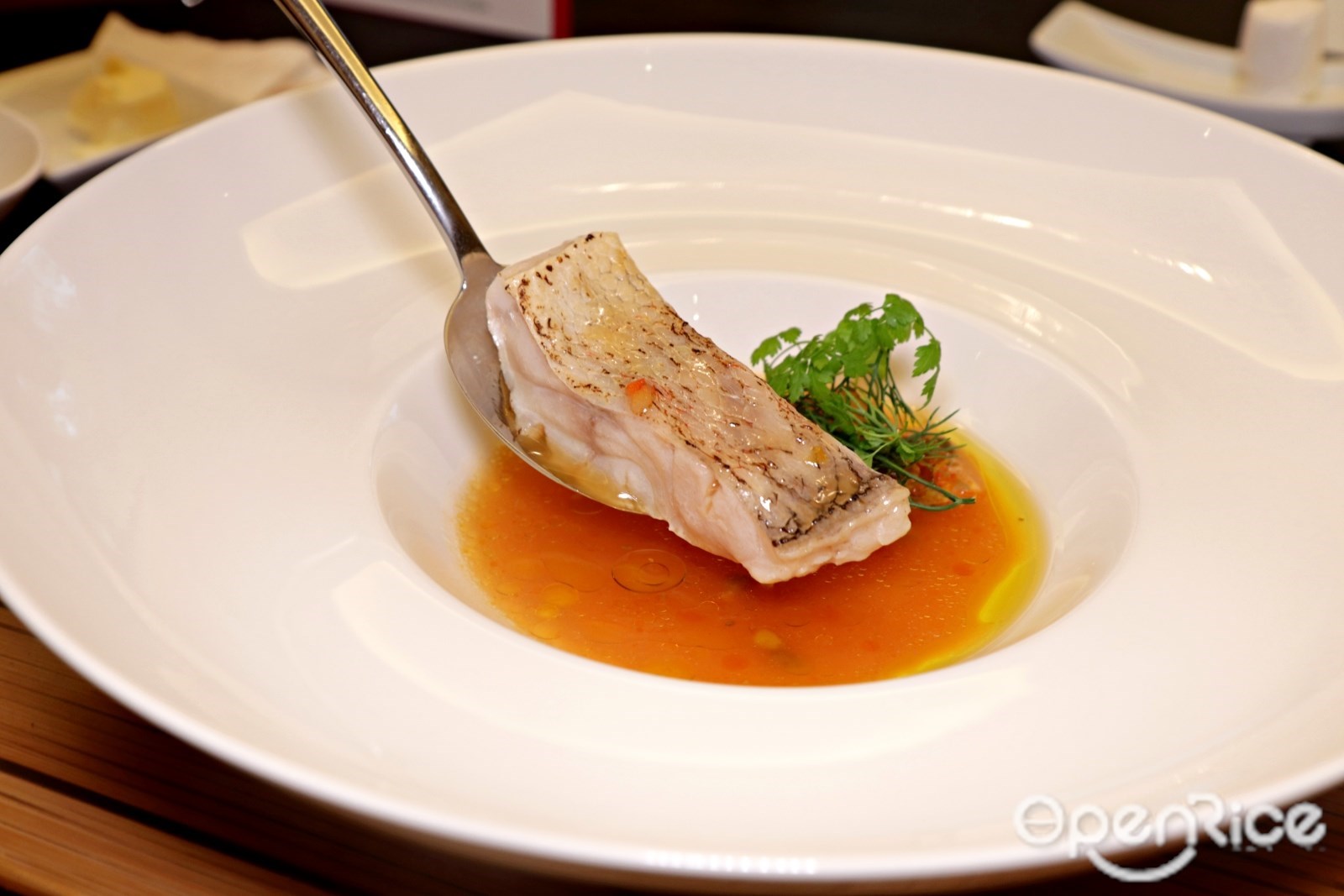 主廚驚喜之作「季節鮮魚與西西里魚湯」,選用時令鮮魚,清蒸以保留魚肉的鮮甜與彈性。搭配一側酸豆與番茄燉製的義式蔬菜,選用洋蔥、西芹、番茄及茴芹,與各式海鮮同煨,並加入橄欖、香料與少許檸檬汁,更巧妙的將茴香以細緻粉末的放式融入菜中,展現茴香不喧賓奪主又內斂之美,呈現細膩而均衡的風味層次。
