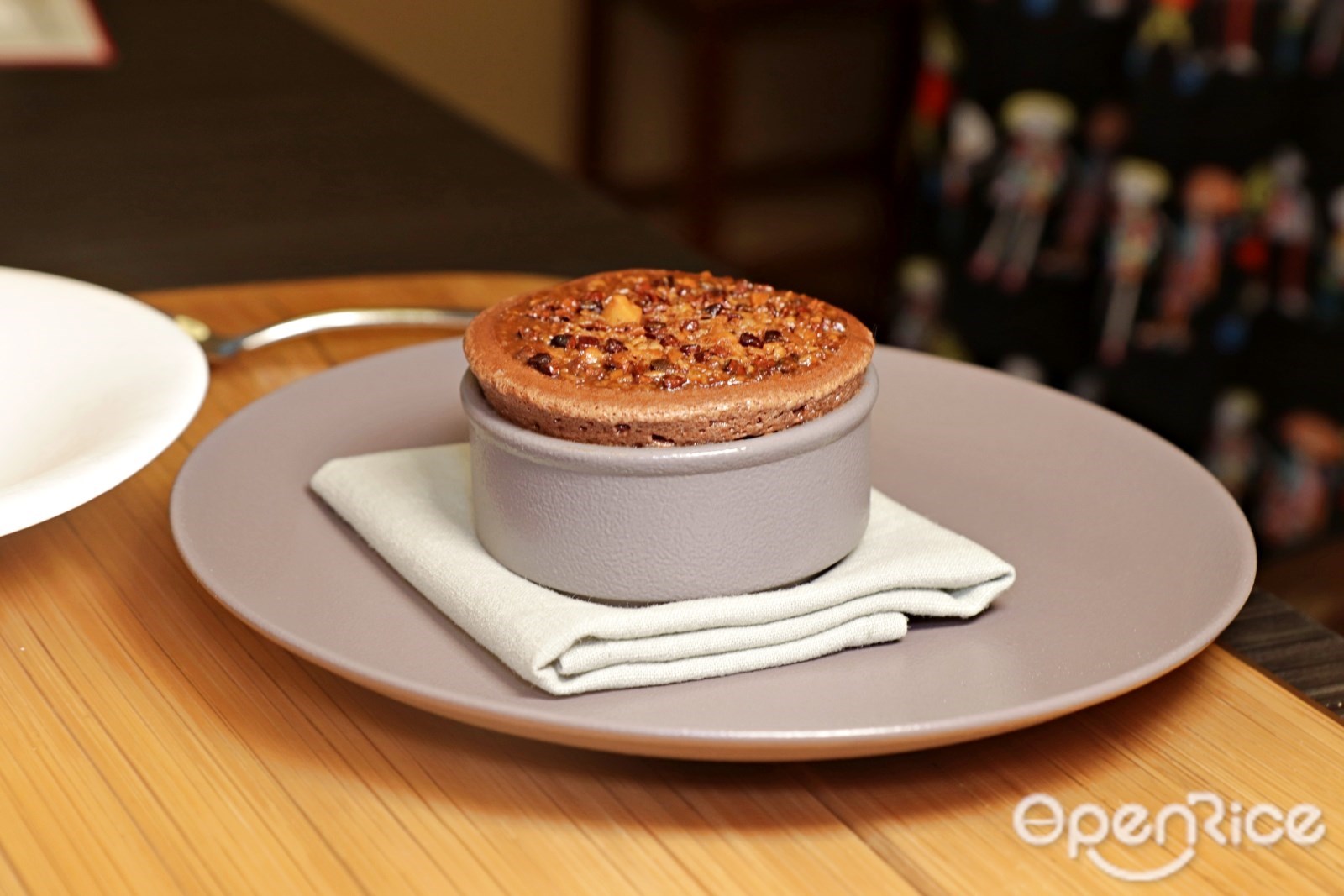 餐期結尾絕對不馬虎!暖呼呼的「巧克力舒芙蕾」中間加入 72% 可可巧克力,微苦甜風味自然沉穩。頂層撒上巧克力碎與夏威夷果增添口感,一旁搭配榛果與焦化白巧克力冰淇淋,細膩香氣與溫潤口感在舌尖收束整場餐宴,為秋季饗宴畫下完美句點。