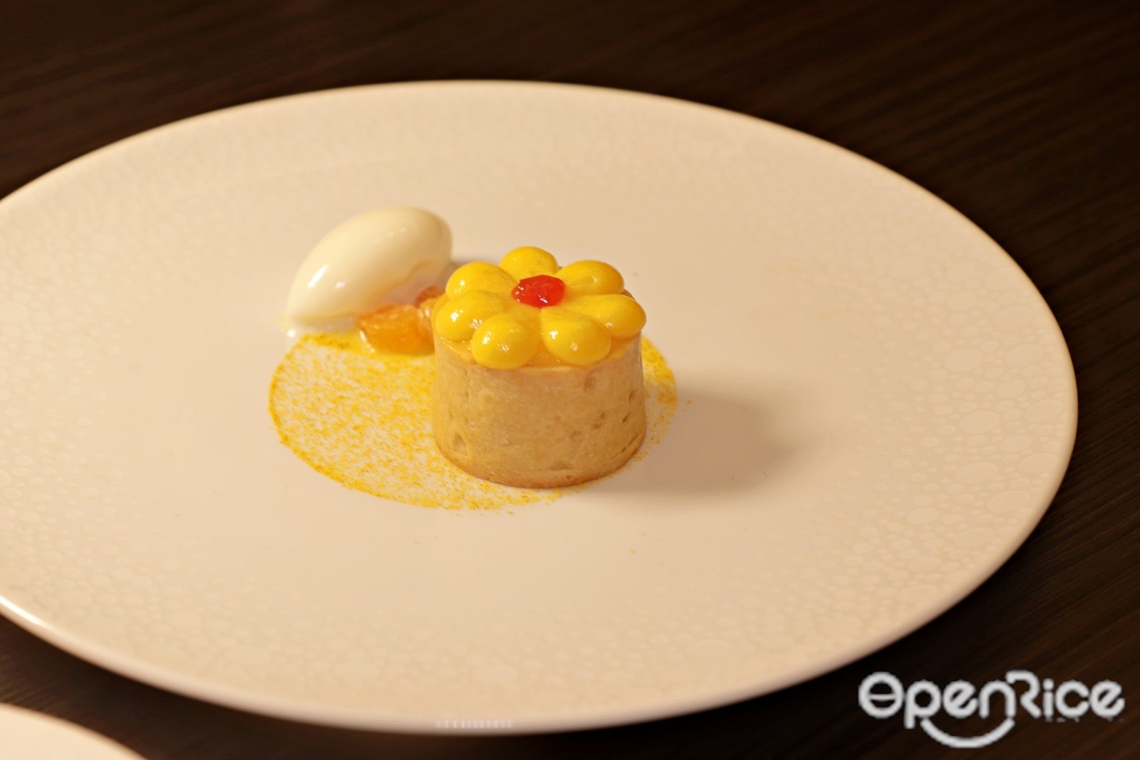 主廚套餐以為則是搭配「蜜柑塔」外層以堅果塔皮烘烤至金黃酥脆,包覆內層柔滑的烤Ricotta內餡,堅果的醇香與乳香緊密交融。中央鋪上以新鮮蜜柑慢熬的果醬與果肉,酸甜分明,點綴微苦的金巴利蜜柑醬,平衡味覺的深度與節奏。