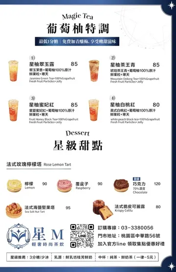 來桃園找朋友逛街吃美食,口渴了就想來杯桃園才喝得到的飲料,朋友知道我不想喝連鎖品牌,就帶我這家開幕才兩個月的-星M輕奢時尚茶飲但我看裝潢擺設跟店員服務都很到位,一點都不像是新開的店家,一問才知道這裡是之前北台灣唯一的金色魔法飲料,現在老闆自創的品牌~延續以往的精品定位,繼續提供高品質的好茶,價錢乍看比較高,但有免費珍珠可以加,銅板價還能加100%水果原汁,算起來其實一點都不貴不定期還推出各種季節活動,店員還預告聖誕節要送一百杯飲料,還加碼再送聖誕提袋,官方帳號還不定期有好康,消費集點還能輕鬆換好禮~星M輕奢時尚茶飲不只是飲料店,還聘請專業甜點師傅,製作手工甜點,價格一百左右就吃得到,推薦給口渴想吃下午茶的朋友,星M輕奢時尚茶飲絕對是最佳選擇!星M輕奢時尚茶飲裝潢走一股太空夢幻的風格,我好喜歡這種宇宙風,給人一種超越現實的未來感,散發出強烈的高尚氛圍~原本很擔心價格會不會很貴,其實算一算50元就可以喝到加料的飲料,價格跟一般飲料店差不多,重點不定期還有很多促銷好康,可以說是我們省錢族的福音星M輕奢時尚茶飲位置地點真的非常好,從桃園車站過來不用幾分鐘就到,而且店面是在新大樓,附近規劃很好,也比較不用擔心環境衛生會有疑慮,讓我喝飲料可以很安心!星M輕奢時尚茶飲附近好熱鬧,統領百貨、唐吉軻德、ATT通通在附近,還有動漫主題商店,光南商場,未來捷運綠線通車後,附近一定會更熱鬧~~~ 親切店員一看到我靠近,就開始介紹起星M輕奢時尚茶飲的好茶,選用的茶葉相當完整,泡起來的茶香跟韻味特別濃厚,只能說一分錢一分貨,這個品質完全對得起價格!星M輕奢時尚茶飲試喝星M輕奢時尚茶飲一大特色就是試喝不手軟,我很少看到店家會給這麼多種試喝,不用擔心要拆盲喝,味道不用靠自己想像,直接適合最準,還能透過試喝調整甜度,找到自己最愛的味道,真的太佛心星M輕奢時尚茶飲菜單我試喝了好多種,正在思考要什麼口味,就有客人居然全部口味通通買一杯,她說這家飲料無雷都好喝,所以等等她們要唱歌就決定全買大家隨機喝~星M輕奢時尚茶飲-新品菜單這一季新品是古早味麵茶,使用老師傅傳承三代的手炒麵茶,堅持手工製作真材實料,喝得到麵茶沙沙的口感,味道非常濃郁,加入鮮乳坊鮮乳更多了一股絲滑感~星M輕奢時尚茶飲-特調菜單/甜點菜單不只原茶可以自己DIY搭配,葡萄柚特調系列更是高人氣,寒天跟果肉通通吃得到。搭配星級甜點一起享用,聖誕優惠超多好康活動一個接一個,星M輕奢時尚茶飲聖誕節提供免費好禮,英式白桃紅免費喝,還再送免費聖誕保溫袋,只要加入官方LINE傳聖誕快樂就可以免費喝,限量一百份動作要快~學生優惠體諒學子的辛苦,星M輕奢時尚茶飲憑學生證可以折十元,對於學生朋友來說划算不少,老闆真的很有愛心~ 集點活動/生日優惠只要加入會員就可以免費獲得1點,消費一筆就再送1點;只要集滿兩點,即可獲得10元折價卷~集滿6點獲得星柚蜜妃紅、集滿10點獲得可麗露一顆,身為省錢王當然不能錯過這個好康而且生日當日不限金額消費,還可以免費兌換甜點一份,星M免費幫您慶生,一般飲料店都要集滿十點才有好康,星M超大方不用集滿就有獎勵可以拿~星M輕奢時尚茶飲杯身飲料的杯身真的好漂亮喔,宛如星空一樣璀璨奪目,深藍色系好有質感,一杯飲料、一份甜點,大家不要苦惱下午茶吃什麼了,星M輕奢時尚茶飲是您絕佳的組合~星M輕奢時尚茶飲-免費提袋只要消費滿三杯以上就會免費送提袋,這也太好康了吧,而且袋子的質感超好,可以重複使用,輕巧好收納放包包也沒問題,聽說過年還會推出金色的提袋,感覺充滿喜氣~頂級培火烏龍 80元 基底茶的選擇總共有8~9款,其中最猛的原茶我就覺得就是這杯頂級培火烏龍,烏龍茶韻味有夠濃厚,不會有任何的苦澀感,尾韻的好香醇,愛喝無糖的朋友這杯一定不能錯過~頂級培火烏龍茶色真的好美,琥珀色澤相當迷人,陣陣的茶香很迷人,愛吃配料的朋友,還可以免費加珍珠,不過珍珠是限量的,要吃的朋友記得早點來~星M輕奢時尚茶飲-水果系列我很喜歡喝水果系列的茶飲,但我其實不喜歡用濃縮汁的水果茶飲,原因就是太甜,而且濃縮汁可能有不確定的添加物,新鮮度也沒有原汁來得好,星M輕奢時尚茶飲使用100%水果汁,喝起來更原汁原味翠玉茉香(檸檬汁)75元 檸檬搭配綠茶真的很搭,非常爽口,尤其吃炸物或烤物後,喝上一杯非常解油膩,推薦大家吃飽後來一杯,甜度建議可以三分糖,酸酸甜甜有種初戀的滋味~再次強調星M輕奢時尚茶飲的檸檬汁是原汁,老闆寧可成本高一些,也要用最好的檸檬汁,給客人喝到最自然的風味,喝完一大杯也不怕會有負擔~英式白桃紅(柳橙汁/檸檬汁) 85元 這杯是英式白桃紅+柳橙汁+檸檬汁,真的是爆炸好喝,店家請我試喝我才知道可以這樣搭配,酸酸甜甜口中充滿果香,茶汁又可以除去甜膩感,這杯水果茶超順口,我非常喜歡新品麵茶系列季節新品是老闆精挑細選的麵茶,使用老師傅傳承三代的手炒麵茶,搭配鮮乳界LV的高品質鮮乳,兩者迸出嶄新的的奇妙好滋味~愛嚐鮮的朋友一定要來喝麵茶焙火烏龍拿鐵120元麵茶搭配焙火烏龍拿鐵很奇妙,麵茶的香氣跟烏龍的韻味相互襯托,在口中的香味停留許久,原本擔心會有苦味,沒想到完全沒有,鮮乳成為兩者間的橋梁,讓飲料喝起來好順喉~麵茶飲料真的很難得可以喝到,這一杯充滿