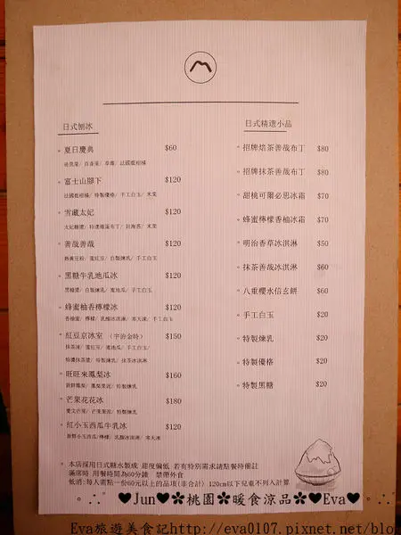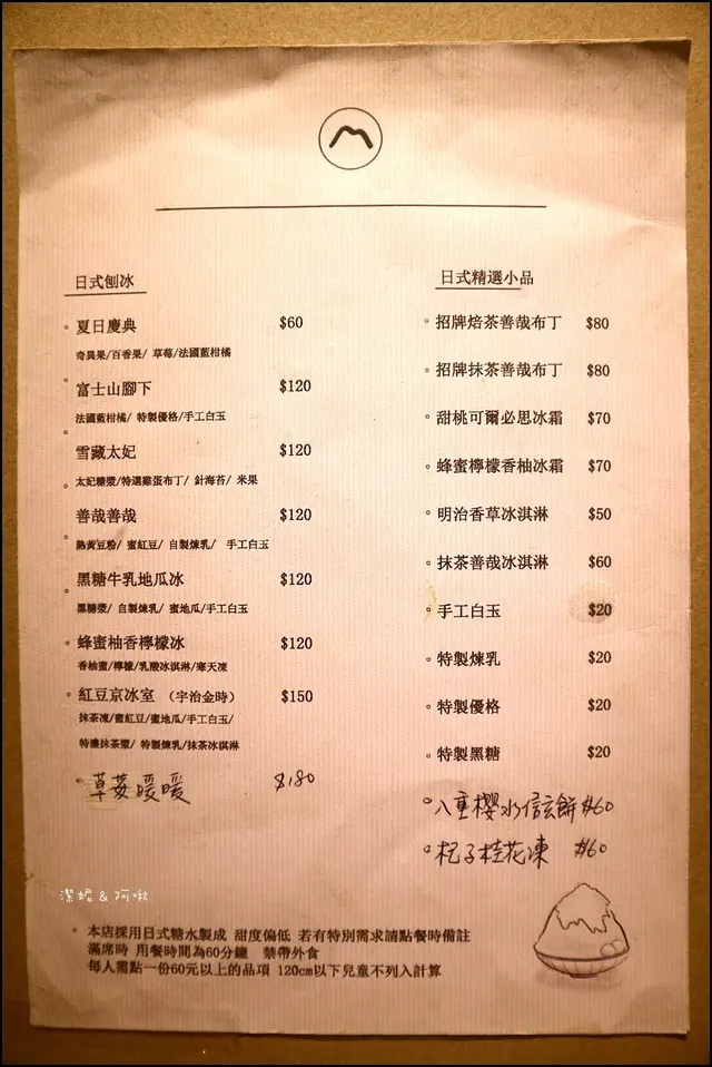 很少嚐冰品,也慣於只吃三餐,因此對冰品類的情報出清總是困擾。這天剛好午餐吃得晚又吃得多,索性用冰品當晩餐簡單裹腹(小朋友不要學),於是來到民富三街上的暖食涼品。 店家一看就是最近流行的文青風格,無論裝潢、冰品名稱甚至餐點賣相都是如此。每樣冰品都引人興趣,幸好有抄得推薦款,不至猶豫太久。 富士山腳下 120元 富士山腳下賣相一整個清涼,藍柑橘冰身搭配白色優格醬,和牆上富士山圖案完全契合,這樣的色調讓人心曠神馳。一旁還放了一碟優格醬,若嫌不夠還可自行淋上。有趣的是還附幾許米果,在享用甜冰品之間,能來點鹹食潤潤嘴巴。 撇開視覺效果不談,其實冰品的滋味也挺好。藍柑橘淡淡清香;上頭淋的優格醬微酸濃郁,很想拿它來佐點沙拉。冰品挖到中間時,還發現埋藏的香草霜淇淋,甜而不膩頗順口。冰品外放了兩顆白玉,Q帶嚼勁。 整體來說,這碗冰的賣相和滋味都不錯,然後想要來碗豐富內容的冰品的人,就會覺得這碗冰的組成有些單薄,因為吃到後來幾乎都只剩藍柑橘碎冰,所以接受度要看個人。倒是這家店無論裝潢、價格或冰品質感都屬文青風格,對我這種庸人吸引力不高,多半僅此一試。…查看更多