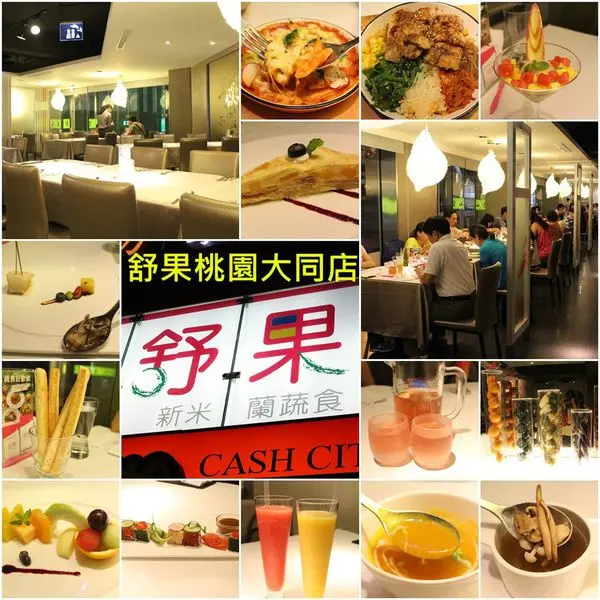 舒果 新米蘭蔬食桃園市大同路11號2F03-3360663餐廳環境秉持「王品集團」的清新、舒適感為設計方向,讓人能很舒適的用餐只不過造型燈具掛的有點太低拉!!! 我的頭不經意的撞到2次 (雖然不會痛~)蒟蒻蕃茄、彩椒水蓮、藍莓山藥服務人員建議由口味較清淡的藍莓山藥開始品嚐,由口味由輕到重(由右→左)才能嚐出每道開胃菜的美味選用日本山藥淋上藍莓醬,略帶黏稠感的山藥混合著酸甜的藍莓醬,偏清爽的口味至於水蓮口感清脆,搭上醬料略為提味,真的是很健康的一道小蔬菜梅子口味的蒟蒻中間包入聖女蕃茄,梅子蒟蒻味道超級夠,加上已經有點梅子味的蕃茄,超好吃時蔬棒沙拉紅蘿蔔棒、芹菜棒、白蘿蔔棒、小黃瓜棒、青椒、地瓜、蕃茄,品嚐時可沾千島醬一起食用杯子裡那"一捲"生菜佐著特製的胡麻醬,嚐起來香氣十足且味道超夠,一致認為好吃義式燉蔬煲選用白菜、芋頭、蒟蒻、筍子燉煮而成,湯頭清爽好入口,且喝起來讓人有種沒有勾芡佛跳牆的感覺牛蒡腰果清湯湯頭由牛蒡熬煮而成,搭配燉煮至軟嫩適中的腰果、蓮藕、菜頭嚐起來湯頭牛蒡味十足,不自覺想抬出"養身"這兩個字,跟"義式燉蔬煲"比起來,這一道更清爽喲花香烤杏鮑菇(佐山藥方磚堡)杏鮑菇以兩百五十度高溫烘烤,再以義大利花香醬滷烤入味;山藥方磚堡夾著山藥及酸黃瓜,創意十足的口味烤鮮蔬芝士通心粉以多種蔬菜與袖珍菇搭配特製奶油白醬進行焗烤果香五穀炊飯以檸檬、柳橙、葡萄、蘋果特製的水果醬汁,搭配菇類及高纖五榖米,非常健康又養生只不過我在品嚐時,最有印象的就是裡面放了好多我愛的松子,吃的好開心呀~天使起司慕斯上層以起司慕斯包裹覆盆苺內餡,搭配芒果蒟蒻,下層則是巧克力蛋糕雖然說是起司慕斯,但我嚐起來倒覺得像是"牛奶糖"的味道,且對我來說有點太甜了…查看更多