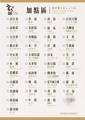 金大鋤壽喜燒中壢店 中壢火車站火鍋吃到飽餐廳『金大鋤壽喜燒中壢店』是今天美食團隊要為大家分享的桃園美食,『金大鋤壽喜燒中壢店』是一間人氣壽喜燒吃到飽專賣店,來自小蒙牛頂級麻辣養生鍋的旗下品牌,店裡嚴選多種新鮮食材,有頂級肉品、火鍋料、蔬菜、甜點、飲料通通無限供應,平日午餐只要399,晚餐假日只要459,午餐時段特別推出商業午餐套餐火鍋,只要249,以上均需加收一成服務費,可以選擇的種類還不少,最近天氣開始變冷了,又是到了吃鍋的好季節,剛好就抽空過來這邊品嘗一下,整體的裝潢佈置,很有濃濃的日式風格,讓人感受到好像來到日本的感覺,用餐環境搭配柔和燈光,營造出悠閒又令人愜意的氛圍!日本飲食文化的多樣性一直讓各國人沉醉其中,從北到南的食材應用方式又各有特色!其中最著名的莫過於壽喜燒,最具日本飲食文化代表。金大鋤壽喜燒,打造全新的日式壽喜燒餐飲體驗,平價消費,奢華饗宴。除了高品質肉品外,同樣注重在蔬菜的嚴選、副食的搭配、飲品的特調,打破壽喜燒只是吃肉的刻板印象,美味不膩能吃到食材真正的精髓。店家位於熱鬧的中壢火車站商圈,在JC PARk食尚廣場裡面,距離中壢火車站走路只要3分鐘,交通上非常便利!接下來趕緊帶大家去,『金大鋤壽喜燒中壢店』和我們一起來探索這家高CP人氣壽喜燒吃到飽吧!▲『金大鋤壽喜燒中壢店』離中壢火車站走路3分鐘的路程,將會看到桃企大飯店!走進去後按下通往4樓,走出電梯就會看到啦,目標非常的明顯,來這邊用餐可以把愛車停在樓下停車場,停車超方便!▲『金大鋤壽喜燒中壢店』一進到店裡就可以看到等候區有舒適的沙發,還有可愛的大鋤寶寶在跟您打招呼,以及多款訂製的和服可以讓客人用餐完穿著拍照。▲『金大鋤壽喜燒中壢店』牆壁有鳥居可以讓您穿著和服拍照打卡。鳥居是日本神社的建築之一,傳說是連接神明居住的神域與人類居住的俗世之通道,屬「結界」的一種。鳥居有多種形狀,但大多均以兩根支柱與一至二根橫樑構成,部分鳥居在橫樑中央有牌匾。▲『金大鋤壽喜燒中壢店』店裡面兩棵漂亮的神樹,應該是說櫻花樹和楓樹,這邊也是可以讓你穿著和服,拍得美美噠!瞬間變成網美啦!▲『金大鋤壽喜燒中壢店』採濃烈的日式風格來設計,讓人用餐感受到像是到了日本當地,用餐環境寬敝舒適,不會讓人有感覺到壓力,可以好好在這邊大口大口的享用美食饗宴!▲『金大鋤壽喜燒中壢店』店內唯一專屬獨立包廂,只要有六人以上就可以訂包廂,在裡面可以與三五好友歡樂談天說地,不怕被打擾!▲『金大鋤壽喜燒中壢店』備有兒童椅,有需要的爸爸媽媽們都可以預定哦!▲『金大鋤壽喜燒中壢店』當月壽星兩位大人同行送大鋤寶寶杯套一個;當日壽星四位大人同行送大鋤寶寶公仔一隻,是不是敲可愛der!▲『金大鋤壽喜燒中壢店』Menu菜單,讓人一目了然,分類單純很容易就知道要點那些東西,湯頭四選一,一般是單鍋選湯頭,如果想要點鴛鴦鍋同時享用兩種湯底就需要再加50摳!主食有5種肉、副食有5種、甜點有4種、飲品冰的有9種、熱的有2種、酒的部分沒有算在吃到飽,所以需要另外收費,除了酒以外其他餐點都是讓你無限吃到飽!▲『金大鋤壽喜燒中壢店』加點區的部分都是以蔬菜類為主,種類有40種可以選擇,真的蠻豐富的!如果喜歡吃蔬菜類的朋友這些也都是可以一直加點!▲『金大鋤壽喜燒中壢店』看到滿桌琳瑯滿目的豐富食材,是不是很令人垂涎欲滴呢?感覺就像一幅美麗的拼圖一樣,讓人好想趕快大快朵頤一番!▲『金大鋤壽喜燒中壢店』剛開始的鍋子就有先放洋蔥和蔥段!▲『金大鋤壽喜燒中壢店』當天我們是用鴛鴦鍋,點鴛鴦鍋需要加收50摳,不過可以同時吃到兩種湯底很划算,當天我們是選壽喜燒和番茄湯底。算是最多客人點的招牌湯底!壽喜鍋-先把洋蔥和蔥段炒香,然後倒入壽喜醬汁與白開水調和煮滾,再一一加入肉類、蔬菜烹煮,醬汁嚐起來不會死鹹反而有一股甘甜味,完全不用再沾其他調味料和沾醬呦!蕃茄鍋-跟其他火鍋店不一樣的是湯頭是加入新鮮蕃茄與蔬菜一起熬煮,喝起來湯頭很鮮甜不膩口,放入的蔬菜、麵食類與火鍋料沾滿酸甜的茄汁讓人忍不住一口接著一口耶!▲『金大鋤壽喜燒中壢店』剛開始先上的開胃小菜-黃金泡菜、毛豆,店家使用的黃金泡菜使用新鮮食材,純手工製作,加上獨特配方,酸酸甜甜的,淡淡的蒜頭香氣小朋友們也敢吃,還一直續點耶!毛豆當作開胃菜也是非常的開胃,越吃越涮嘴。▲『金大鋤壽喜燒中壢店』基本菜盤,剛開始店家會先把配好的菜盤上送來,裡面的蔬菜類蠻豐富的有香菇、金針菇、紅蘿蔔、玉米、青江菜、豆腐、大葉杉藻、豆皮、貢丸....等,如果吃不夠都可以一直加點!▲『金大鋤壽喜燒中壢店』吃壽喜燒主要的靈魂是什麼?那就是 【蛋】,是採用大武山的生鮮有機蛋,蛋黃飽滿,無蛋腥味,用壽喜燒煮了顆溫泉蛋,鹹鹹甜甜的,超滿足的!▲『金大鋤壽喜燒中壢店』左邊為壽喜燒醬汁、右邊為白開水,如果不知道怎麼抓比例的朋友,可以先把壽喜燒醬汁全部倒入鍋裡去煮肉,如果覺得太鹹,再慢慢倒入開水去稀釋,不要一開始就把開水全部到進去壽喜燒裡面,這樣味道會變得很稀,涮起來的肉片也會比較不入味,建議先用壽喜燒原汁去煮肉才會口味最佳!▲『金大鋤壽喜燒中壢店』團員們肚子太餓受不了就先把