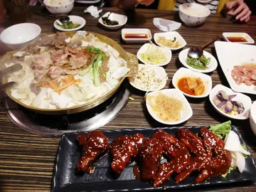 海鮮煎餅 180元 (我個人很推薦,真的很好吃 )現煎的外皮非常香酥脆 裡面有花枝及蝦仁 沾著醬汁好好吃喔份量上也很足夠 這道當然要趁熱享用才會好吃喔韓式炸雞(原味不沾醬 / 辣味沾紅醬 兩種) 260元 共6支(小雞腿 、雞翅各3支)8月新菜 醬汁有點像糖醋 辣味是後勁才會出現 基本上也很難形容 不過有對了我的胃這道也是要剛炸好趁熱吃才會好吃喔~ (冷掉的話,醬汁讓炸雞的口感就會比較油膩些....)第一次8月初吃的時候還不會很辣後來第二次再訪 後勁的辣有點強烈,感覺有調整過 因為沒在韓國吃過 ,所以也無從比較 ~ 但老闆及老闆娘好像是韓國來的樣子? :) 雞肉肉質鮮嫩不會柴,炸的技術很好,且有淡淡芝麻粒香 感覺每家店做法都不太一樣這家做法是炸好再沾紅醬 ,所以些微的酥脆口感還會在春川辣雞 220元 (別桌點的,所以口味無法形容但看起來感覺很不錯喔)肉好像選用雞胸肉的部位 (感覺肉質很嫩~)店員會先在旁邊拌炒的服務喔拌炒完 ,滿的好料讓整鍋的高麗菜看起來相當美味耶!!需付費韓國飲品(果汁 、酒)可樂 、雪碧...等無限暢飲(喝到飽XD)重點! 小菜吃到飽(而且也很好吃喔)泡菜 、甜不辣 、海帶 、苦瓜 、花椰菜 、豆干 、豆芽菜 、生菜沙拉 、茄子非常豐富~還有特別的黑豆 :) 小菜旁的熱蔬菜湯 也可以無限喝喔第2次再訪-我們點了銅盤烤肉及韓式炸雞 銅盤烤肉(牛/羊/豬 擇一) 480元 附飯兩碗 ,二人份因為是單點所以份量上較精緻 ,兩位男生可能會不太夠吃但肉的品質也比起吃到飽感覺比較新鮮衛生一點囉第二次換了擺盤方式,第二次吃的時候我個人覺得超辣!! 我比較喜歡第一次的辣度...基本上肉本身就有淹過醬汁,不沾也很好吃。但再沾一點點也很下飯喔~ 用餐桌椅&店家環境 餐桌非常寬敞喔~~ 座位很舒適環境空間都很大 金首爾韓國館也是在網路看過其他人分享才會知道他所以也會從中知道某些菜色要注意一下 ,評價比較普通但海鮮煎餅 、銅盤烤肉 、春川辣雞 、韓式炸雞這四道評價都算很好 另外菜單上的人參雞湯也讓我很有興趣 …查看更多