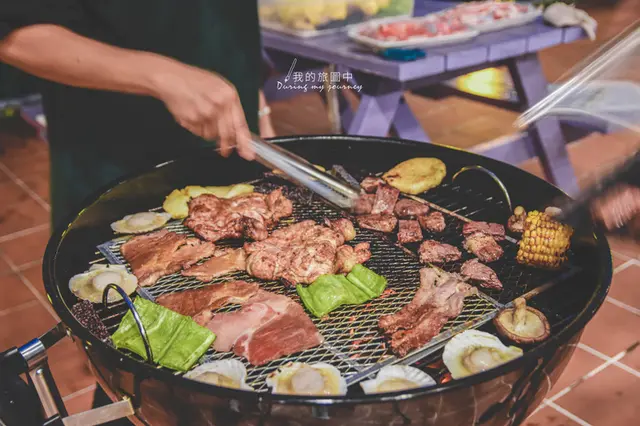 隨著烤肉的香氣四處飄散,我們烤著豐富的食材,有玉米、甜不辣、干貝、雞肉、豬肉、青椒、香菇等等,