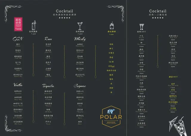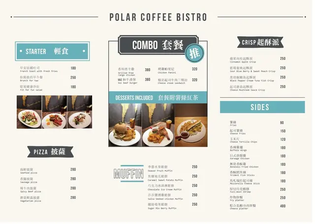 ▲『寶樂咖啡餐酒館 Polar Coffee Bistro』Menu菜單,可以看到有輕食、披薩、套餐、甜點、起酥派、點心、雞尾酒、調酒....等,只要點套餐就會附薯條、紅茶,這邊是餐酒館,所以調酒類品項真的超多種的,喜歡小酌的朋友一定要親自來體驗看看囉~