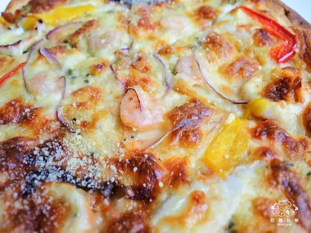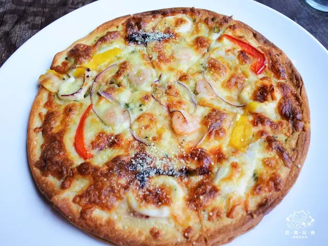 屬於薄餅皮披薩,餅皮吃起來Q軟又帶點酥脆,吃起來像餅乾的薄脆餅皮,配料有蝦仁、花枝、洋蔥、甜椒,沒有過多的醬汁,簡單用香料粉跟起司粉提味,更能提出海鮮的香味,口感清爽不油膩,是外面比較沒有吃過的口感,怕胖的人也可以放心吃。