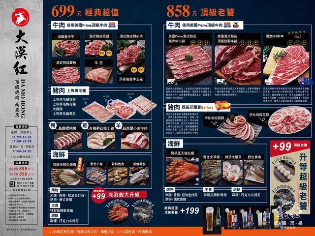 ▲『大漠紅頂級燒肉 南崁店』Menu菜單,有699超值餐、858老饕餐、2種方案選擇,每種價位可以選擇的食材都很豐富,以上服務費另計,超值餐+99元就可以享天使紅蝦及目前最火紅的泰國流水蝦吃到飽;老饕餐+99元享日本生食級干貝及活跳跳泰國蝦吃到飽,此外超值餐和老饕餐只要+199元就可以讓你海尼根生啤酒喝到爽!