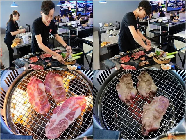 ▲『大漠紅頂級燒肉 南崁店』當天就有請這位小鮮肉帥哥服務員幫我們烤肉,桌邊服務很不錯哦!他烤肉的技術也是屬於Pro級的,果然專業的就是不一樣,烤出來的肉都很完美,真的感覺非常的棒!服務人員有空會幫忙烤。烤網換得很勤,店員服務很好,有專門的烤網更換架。現在很多燒烤店很注重肉的品質,會在客人烤肉的同時幫你換烤網,這樣才可以吃到狀態最好的肉,再吃的時候,服務生很主動幾乎是烤一兩盤肉發現有點焦黑就會主動換一次烤網,如果碰巧沒有注意到,只要你主動跟店員提起說要換烤網,也是很快負責人員就會來協助服務烤網更新,非常貼心!