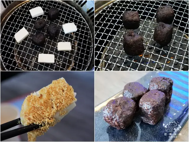 有別於一般燒烤店的麻糬,老闆精選日式麻糬,看起來像豆腐塊,烤起來外面口感比較脆,膨脹後香氣四溢再沾上沾煉乳+花生粉,甜滋滋的口感,非常合拍又好吃!原本是冰的布朗尼,烤了之後外熱內冰口感讓人上癮!很棒的一道甜點!