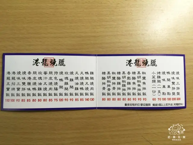 ▲『港龍燒臘』店家的名片打開就可以看到裡面的菜單,想要點那些菜色直接可以看得很清楚,便當只要滿5個以上就可以外送,還附贈飲料!