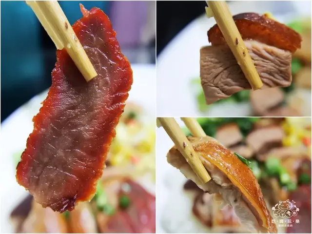 這道三拼盤為店裡的招牌之一,蜜汁叉燒、脆皮燒鴨、脆皮燒肉的組合,兼具香Q、多汁鮮嫩、脆皮口感,一次滿足三種口味。蜜汁叉燒吃起來香氣十足甜滋滋的香而不膩口,都是用瘦肉下去做沒有吃到肥肉的部份,肉也都沒有太乾或太柴的問題,濕潤度很夠非常的入味好吃;脆皮燒鴨吃起來皮香肉嫩香滑入味,皮帶油脂脆脆的,肉質軟嫩嚼起來有彈性,咬下去鴨油的香氣在舌尖裡散發開來,吃起來更完全不會卡牙縫,味道很夠味吃完讓人唇齒留香;脆皮燒肉在南崁的燒臘店是數一數二的好吃,肉嫩嚼起來有彈性,燒肉烤的蠻軟香入味,外皮咬下去有卡滋卡滋的口感,肥瘦相間厚實大塊,單純的鹹香味非常的下飯。