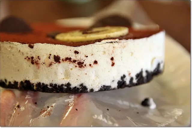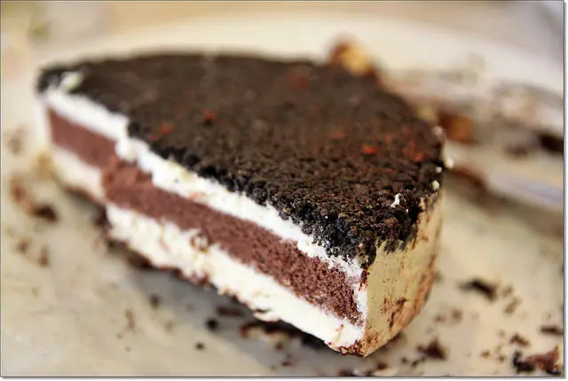 提拉米蘇總共有三層,最上層是比利時可可粉,白白的是頂級義大利Mascarpone,是手作沁涼多層次冰淇淋口感的喔。最下面那一層是手作巧克力餅乾,吃起來很像Oreo的口感與香氣。