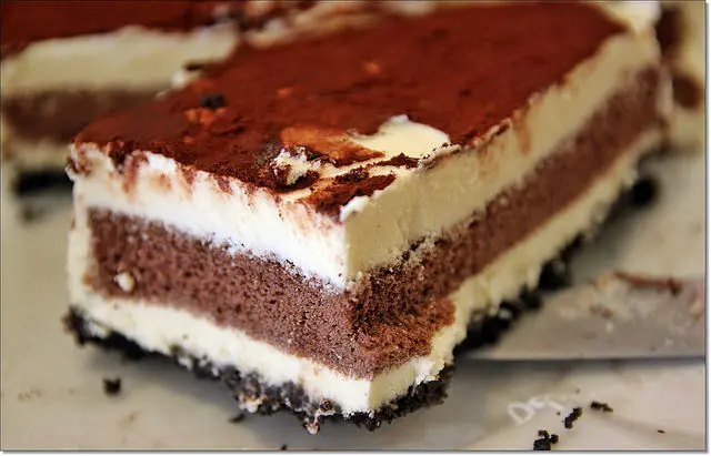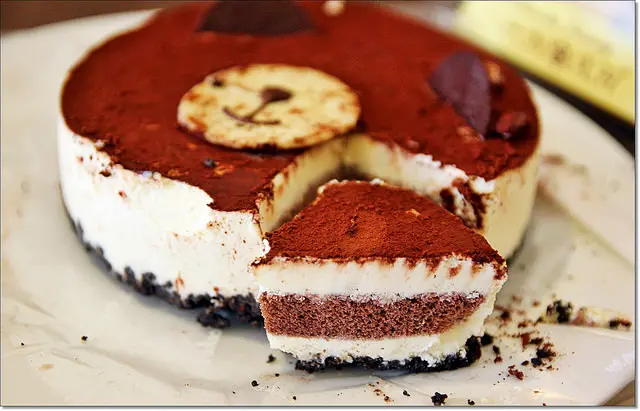 剛剛介紹過了,最上層是比利時可可粉,白白的是頂級義大利Mascarpone,吃起來會有冰淇淋,很滑順香甜又透心涼的口感,中間那一層是卡魯哇巧克力蛋糕,也是吃起來有點苦甜又綿密的感覺,最下面的那一層就是手作的巧克力餅乾。