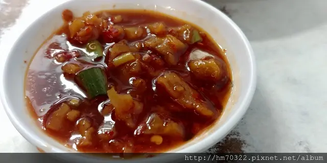 辣醬裡面加了蘿蔔乾?蔥花,與其說是辣醬,味道可能算微辣的鹹沾醬,比較多客人用來沾水餃或魯味