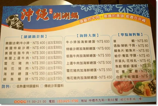 鍋物價格介於NT$250~NT$600之間,內含:主食、菜盤、附餐(白飯、冬粉、烏龍麵擇一)