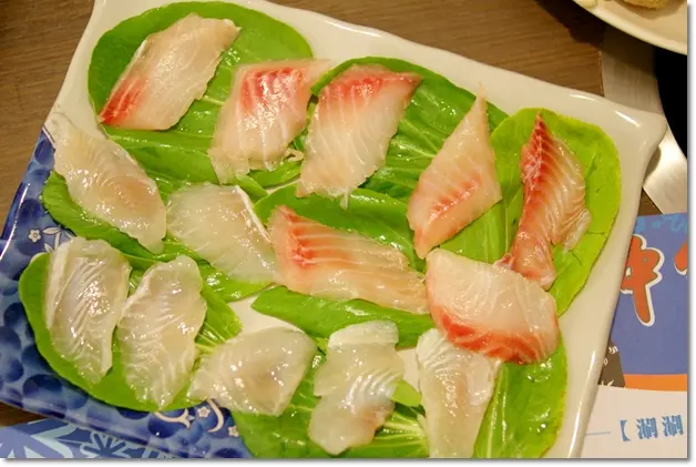 片成適當大小的魴魚及鮭魚已事先剔除骨頭,且不論看起來或吃起來魚片都算是新鮮,還不錯