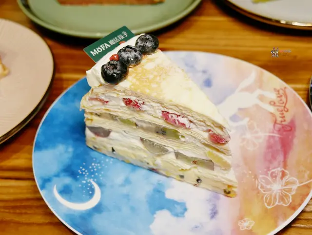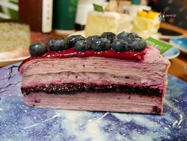 藍莓千層上面放了滿滿的藍莓中間也夾了滿滿的藍莓果醬,吃起來酸酸甜甜滿滿的藍莓香,不過和其他款相較起來,藍莓千層會比較偏甜一些,但因為它酸酸甜甜的特性,吃起來比較不會膩。