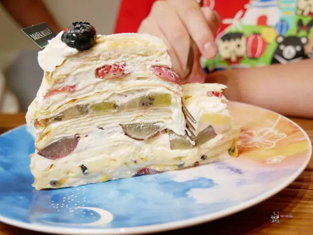 水果千層會隨著季節不同夾入不同的水果,像我們今天吃到的是草莓、奇異果、葡萄和百香果,因為有水果味道吃起來就比較清爽多汁,中間鮮奶油化口性也很好,就像吃到水果牛奶一樣。