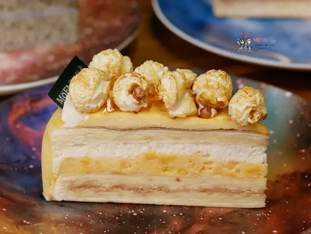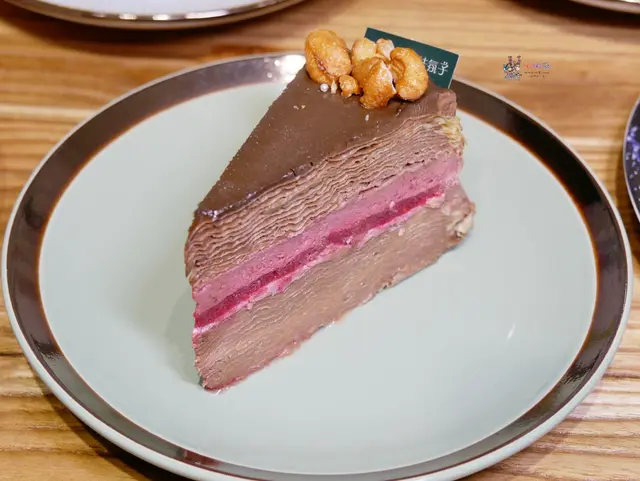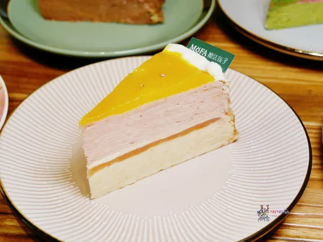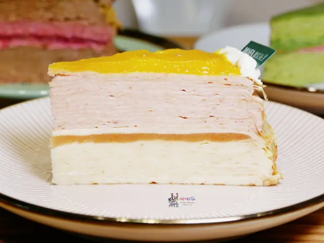 少女心千層中間的夾餡是紅心芭樂和荔枝玫瑰,上面再鋪上滿滿的芒果泥,我覺得以芭樂的香氣為主還有荔枝和芒果的甜味,再加上淡淡清爽的玫瑰香氣,整體吃起來清爽不膩,可以說是今天我也很喜歡的蛋糕之一。